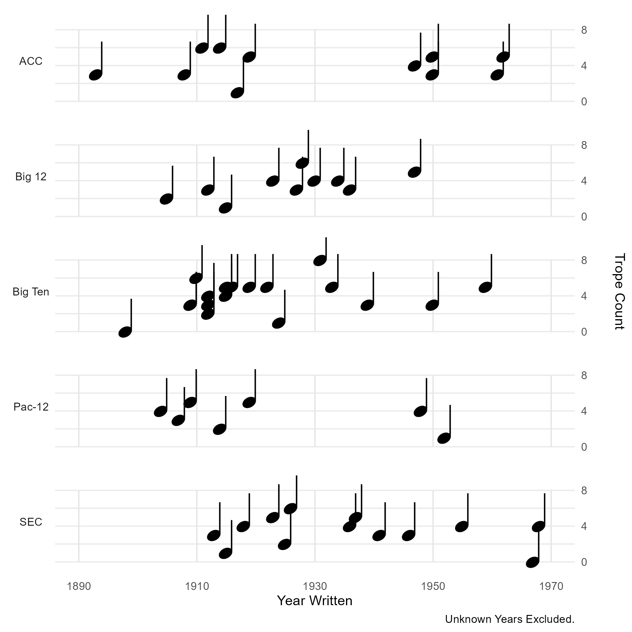 Description: Invoking the musical nature of the data, this dataset imitates sheet music to project the “song” of each conference over time. Each note represents an individual school’s fight song, with its left-right position indicating the year it was written, and its vertical position indicating the number of tropes it contains.